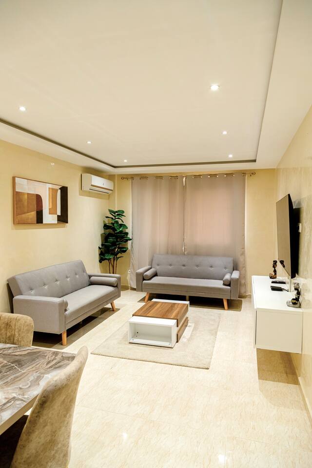 Experience a luxurious city getaway where modern design meets subtle coastal charm and an elegant nod to African roots. This beautifully styled 2-bedroom apartment offers a fresh, welcoming retreat in one of the city’s most vibrant neighborhoods. ⸻ Living Room A beautifully styled space to relax, entertain, or unwind with a view. • Two comfortable sofa beds • Air conditioning • Smart TV with Netflix, Canal+ & Prime Video • Contemporary African-inspired décor • Coffee table • Large window with natural light and city view • Anti-humidity treated walls • High-speed Wi-Fi throughout ⸻ Dining Area A welcoming and functional space for meals or meetings. • Extendable dining table (seats up to 6) • Stylish marble-effect tabletop • Comfortable cushioned chairs • Well lit and open to living area ⸻ Kitchen Spacious and fully equipped with all you need for a short or long-term stay. • Fridge • Oven & stovetop • Microwave • Electric kettle & coffee maker • Blender • Cookware, dishes & utensils • Tea, coffee & essentials provided • Cleaning products & disposable bin • Modern oak-and-black aesthetic ⸻ Balcony One (off kitchen) Practical and private utility space. • Washing machine • Drying rack • City view • Ideal for laundry and fresh air ⸻ Bedroom One (Primary) A spacious and serene retreat with ample storage and a private balcony. • Double bed • Air conditioning • Smart TV with Netflix & YouTube • Large fitted double wardrobe • Access to private balcony with rear view • En-suite bathroom—clean, well-stocked, and designed for comfort: – Walk-in shower – Fresh towels & hand towels – Hot water – Anti-slip shower mat – Oud-scented hand wash ⸻ Bedroom Two A cosy and private second bedroom—ideal for guests or family. • Double bed • Air conditioning • Smart TV with Netflix & YouTube • Fitted wardrobe • Mirror • En-suite bathroom—clean, well-stocked, and designed for comfort: – Walk-in shower – Fresh towels & hand towels – Hot water – Anti-slip shower mat – Oud-scented hand wash ⸻ Guest Bathroom Perfectly placed for visitors or shared use. • Clean, well-stocked, and designed for comfort • Fresh towels & hand towels • Hot water • Oud-scented hand wash ⸻ Additional Amenities • Free Private Chef • Iron & ironing board • Hair dryer • Free secure underground parking • 24/7 security on-site